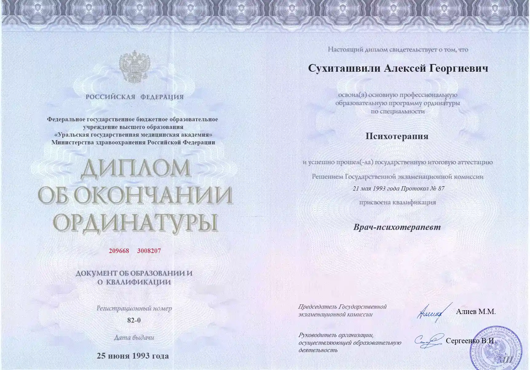 Получил диплом в 1991 году в Уральской государственной медицинской академии по специальности «Лечебное дело». В 1993 году окончил ординатуру по психотерапии, а в 1996 году — аспирантуру по направлению «Медицинская психология», занимался научными исследованиями в сфере психотерапевтических методов лечения.ПЕРВИЧНЫЙ ПРИЕМ: 2000 руб.